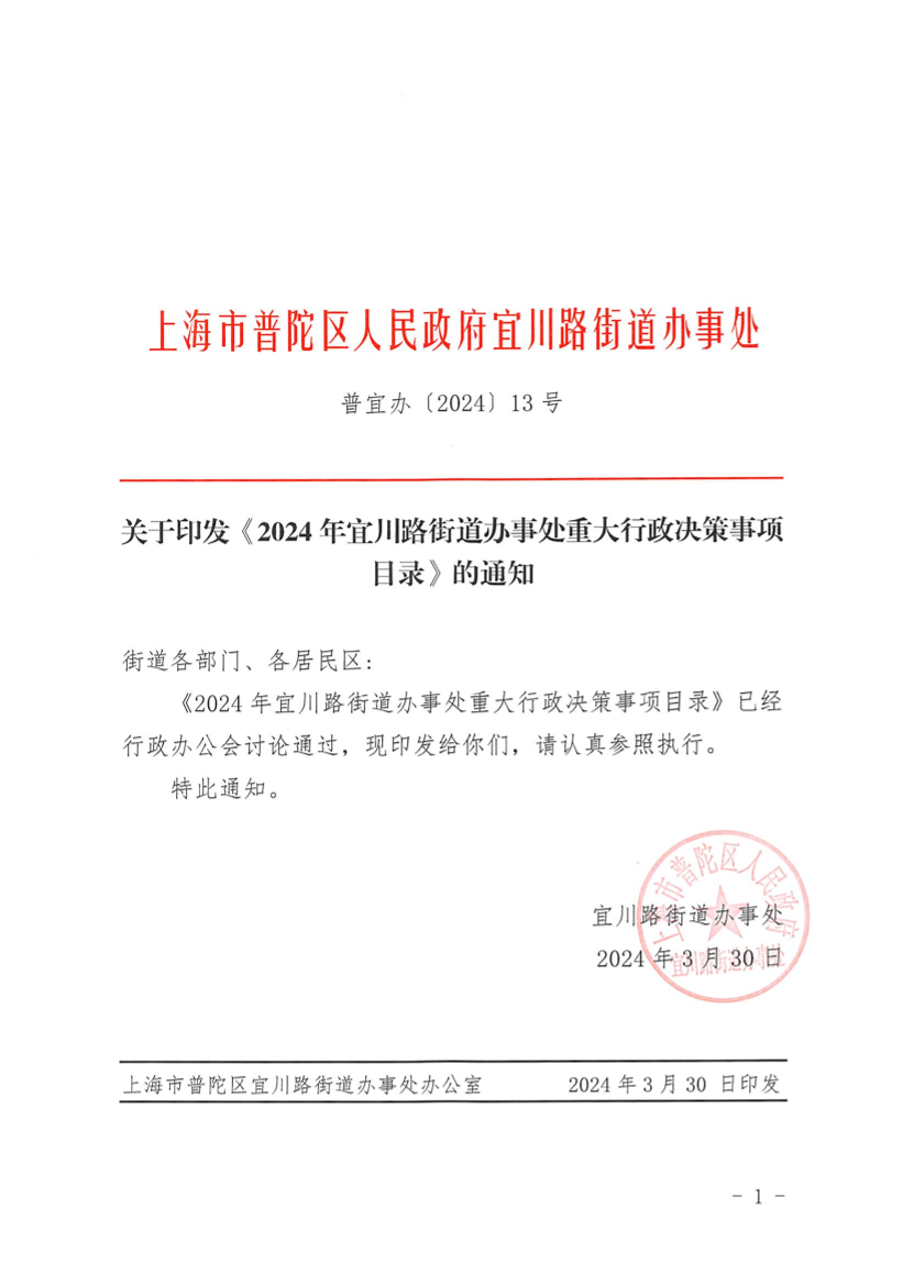 关于印发《2024年宜川路街道办事处重大行政决策事项目录》的通知