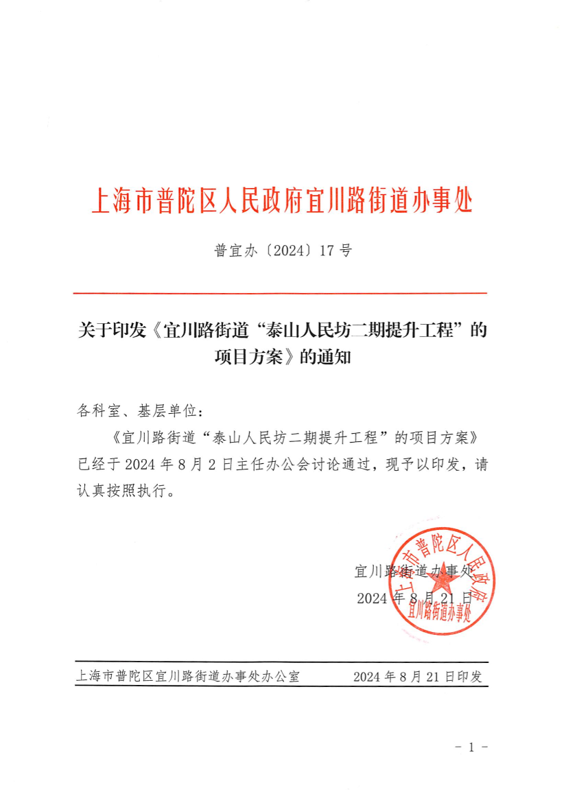 关于印发《宜川路街道“泰山人民坊二期提升工程”的项目方案》的通知