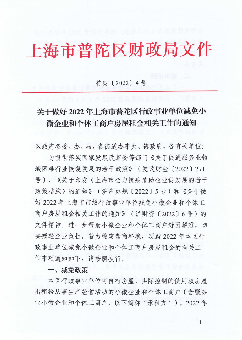 关于做好2022年上海市普陀区行政事业单位减免小微企业和个体工商户房屋租金相关工作的通知