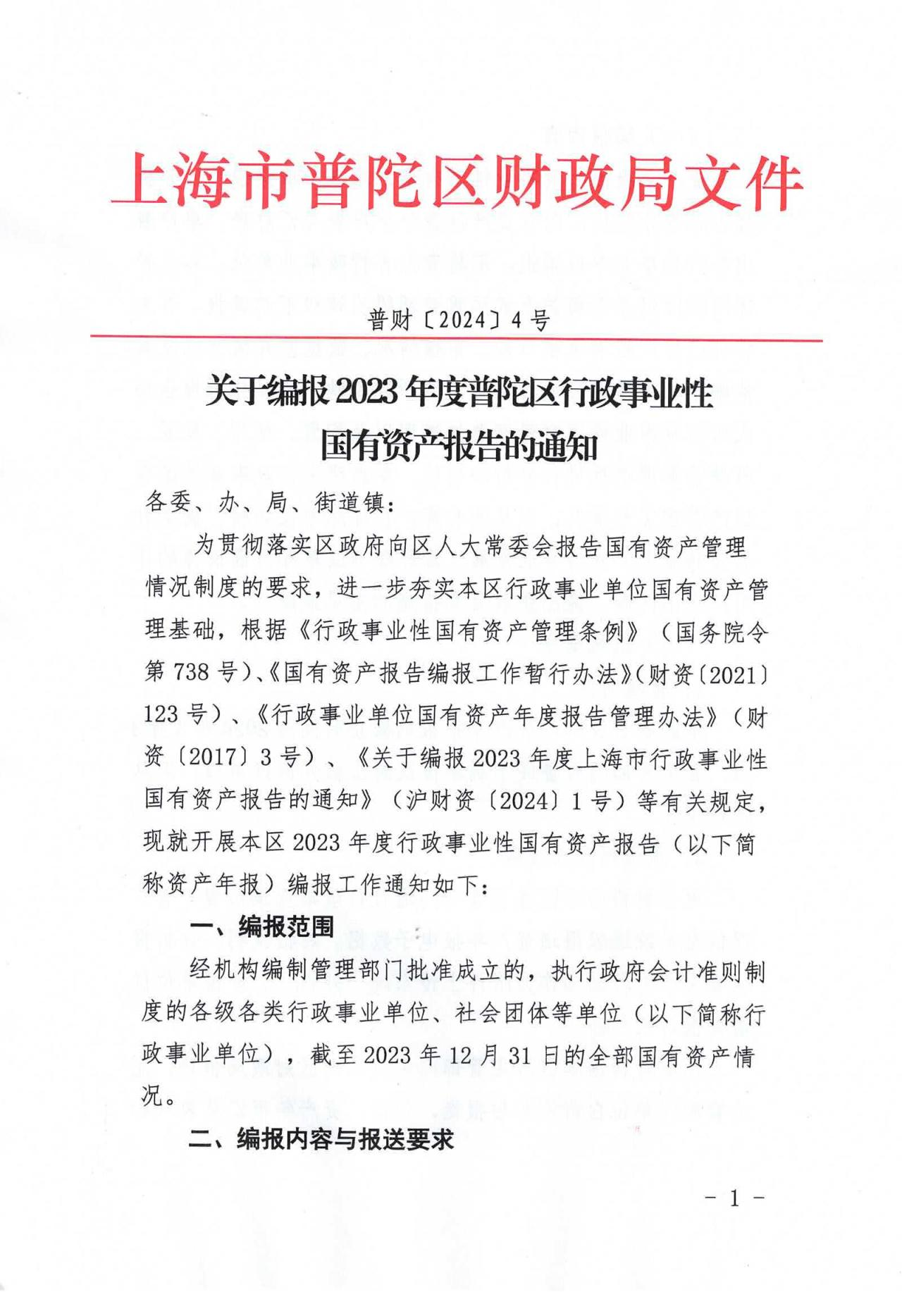 关于编报2023年度普陀区行政事业性国有资产报告的通知