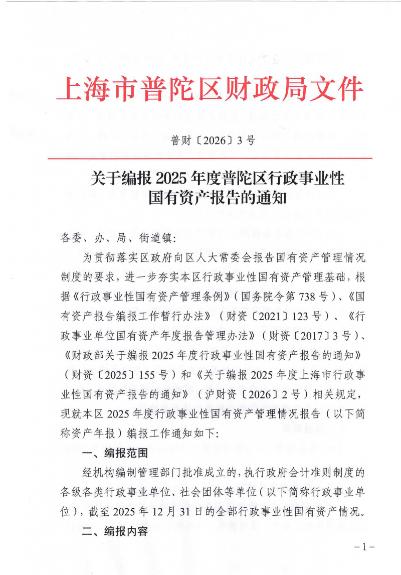 为贯彻落实区政府向区人大常委会报告国有资产管理情况制度的要求,进一步夯实本区行政事业性国有资产管理基础,根据《行政事业性国有资产管理条例》(国务院令第738号)、《国有资产报告编报工作暂行办法》(财资〔2021〕123号)、《行政事业单位国有资产年度报告管理办法》(财资〔2017〕3号)、《财政部关于编报2025年度行政事业性国有资产报告的通知》(财资〔2025〕155号)和《关于编报2025年度上海市行政事业性国有资产报告的通知》(沪财资〔2026〕2号)相关规定,现就本区2025年度行政事业性国有资产管理情况报告(以下简称资产年报)编报工作通知如下: