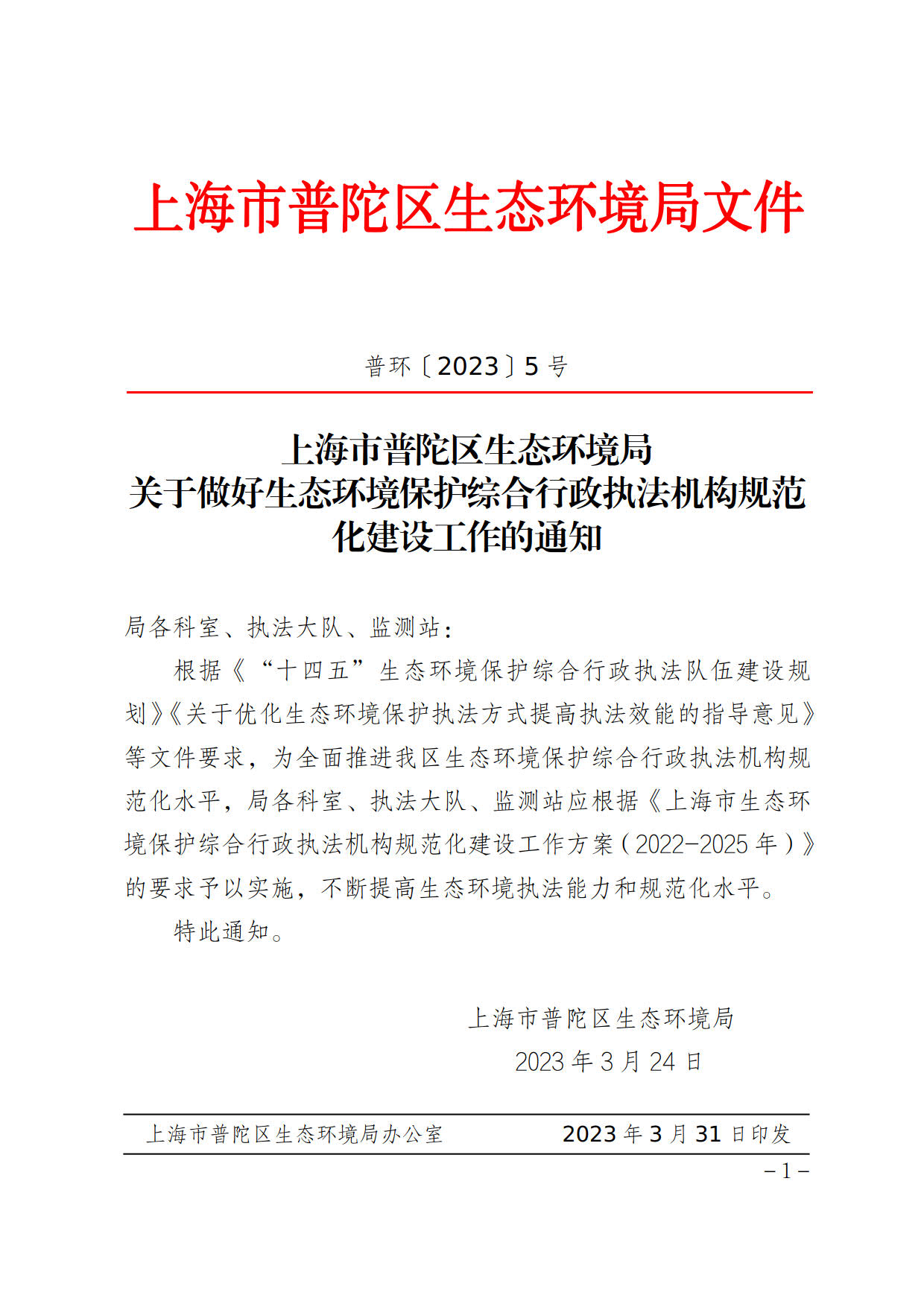 上海市普陀区生态环境局关于做好生态环境保护综合行政执法机构规范化建设工作的通知