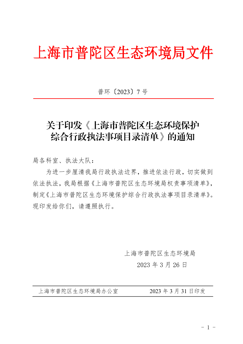 关于印发《上海市普陀区生态环境保护综合行政执法事项目录清单》的通知