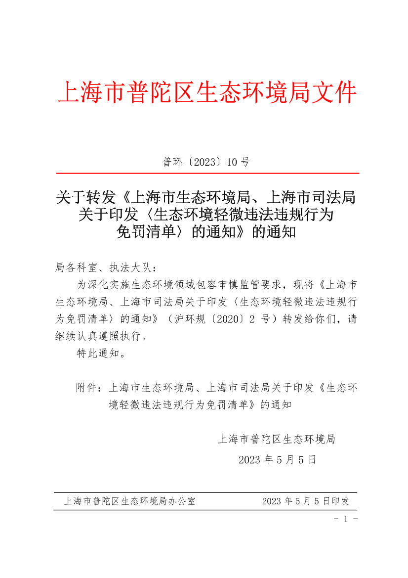 附件:上海市生态环境局、上海市司法局关于印发《生态环境轻微违法违规行为免罚清单》的通知