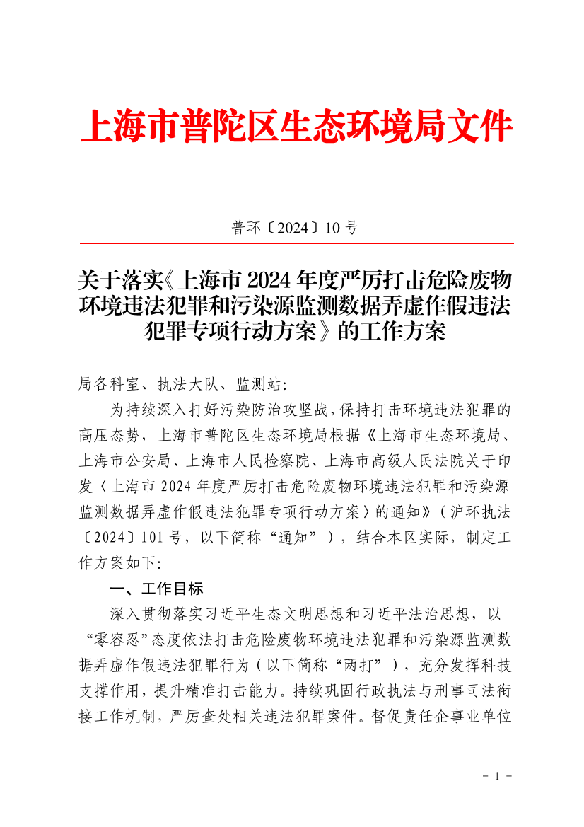 为持续深入打好污染防治攻坚战,保持打击环境违法犯罪的高压态势,上海市普陀区生态环境局根据《上海市生态环境局、上海市公安局、上海市人民检察院、上海市高级人民法院关于印发〈上海市2024年度严厉打击危险废物环境违法犯罪和污染源监测数据弄虚作假违法犯罪专项行动方案〉的通知》(沪环执法〔2024〕101号,以下简称“通知”),结合本区实际,制定工作方案如下: