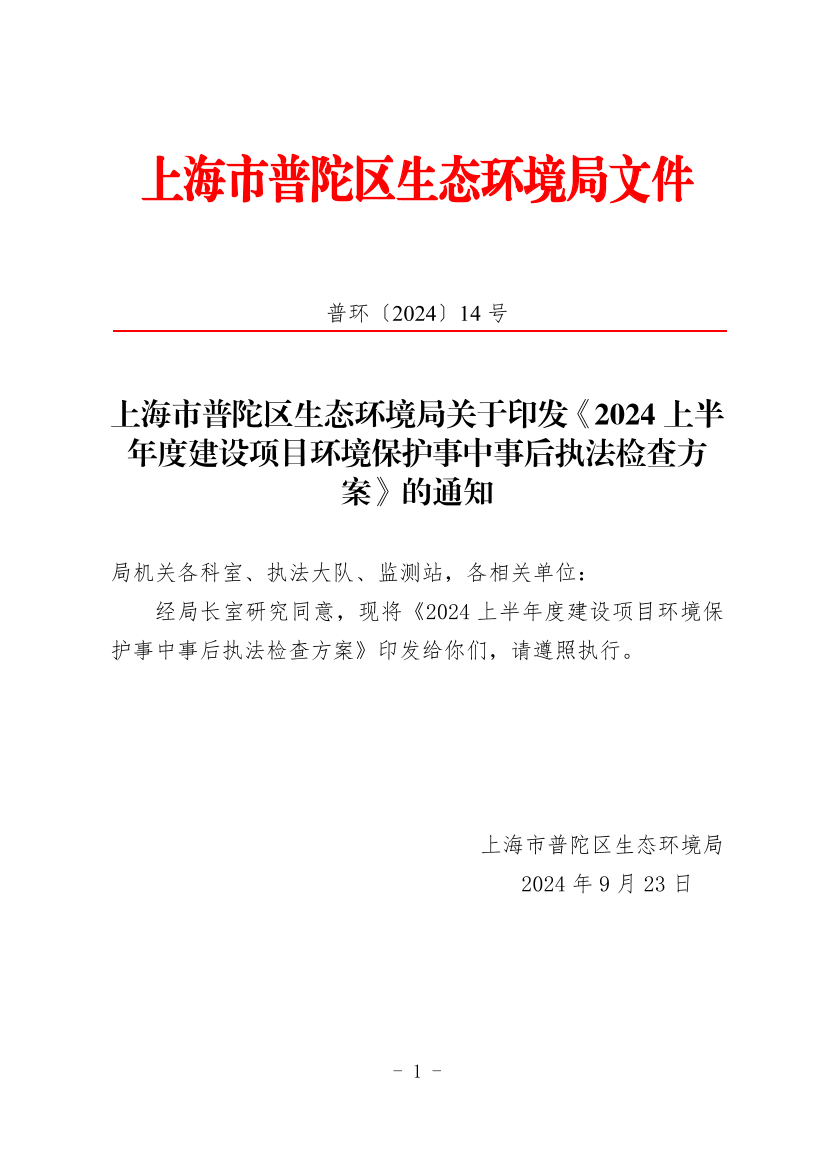 上海市普陀区生态环境局关于印发《2024上半年度建设项目环境保护事中事后执法检查方案》的通知