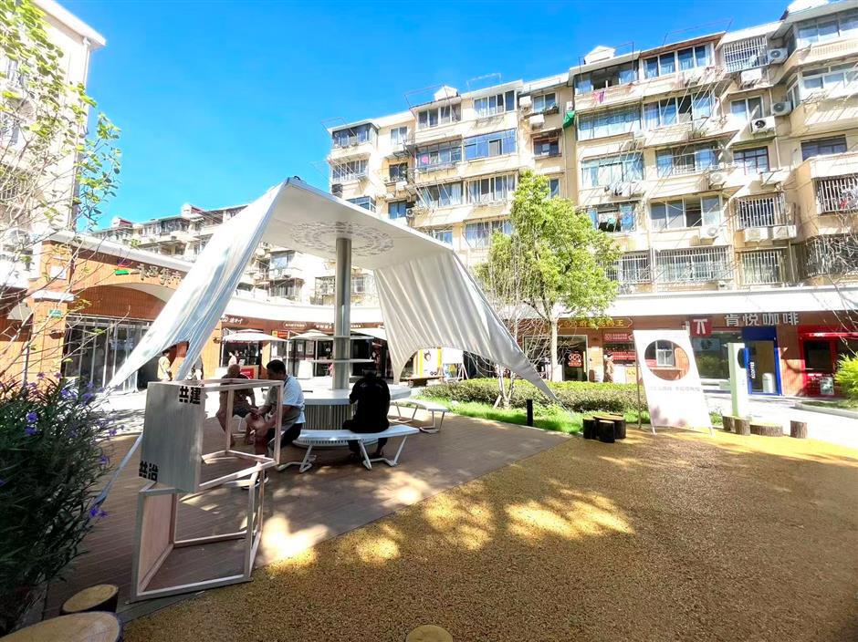 Neighbors chat under the canopy at a newly built public square at the renovated Taishan Community in Putuo District.