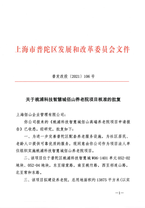 你公司报来的《桃浦科技智慧城佰山高端养老院项目申请报告》已收悉。经研究,批复如下: