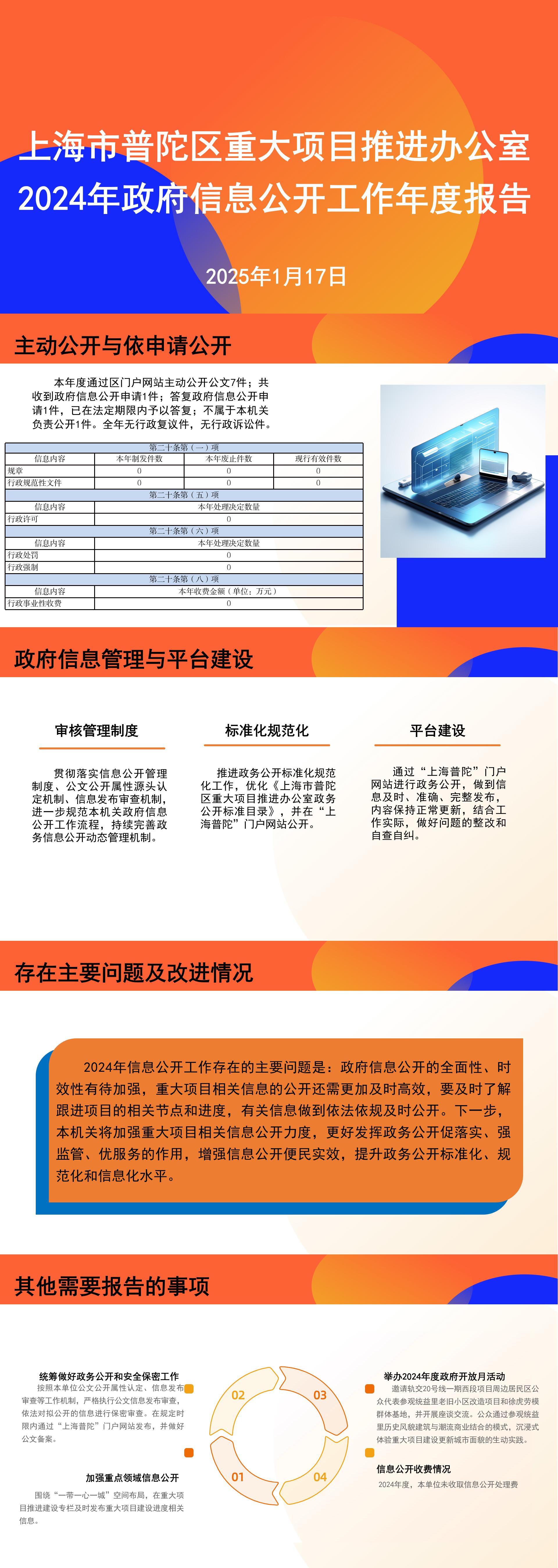 2025年01月20日 来源: 上海普陀本年度报告根据《中华人民共和国政府信息公开条例》(以下简称《条例》)和《上海市政府信息公开规定》(以下简称《规定》)要求,由上海市普陀区重大项目推进办公室编制。全文包括总体情况、主动公开政府信息情况、收到和处理政府信息公开申请情况、因政府信息公开工作被申请行政复议和提起行政诉讼情况、政府信息公开工作存在的主要问题及改进情况、其他需要报告的事项。报告所列数据统计期限自2024年1月1日起至12月31日止。本报告电子版可在上海市普陀区人民政府网站(网址:www.shpt.gov.cn)下载。