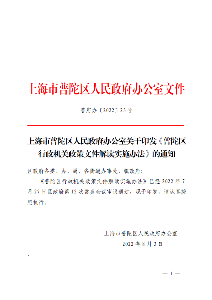 《普陀区行政机关政策文件解读实施办法》已经2022年7月27日区政府第12次常务会议审议通过,现予印发,请认真按照执行。