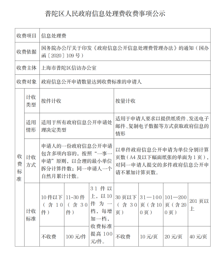 5、本机关依申请提供政府信息的收费严格按照国务院办公厅《政府信息公开信息处理费管理办法》及《上海市财政局、上海市发展和改革委员会关于政府信息公开信息处理费有关事项的通知》执行。