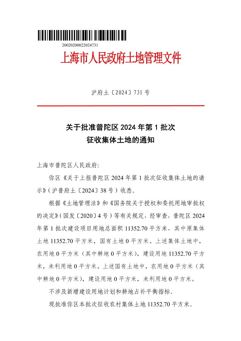 你区《关于上报普陀区2024年第1批次征收集体土地的请示》(沪普府土〔2024〕38号)收悉。