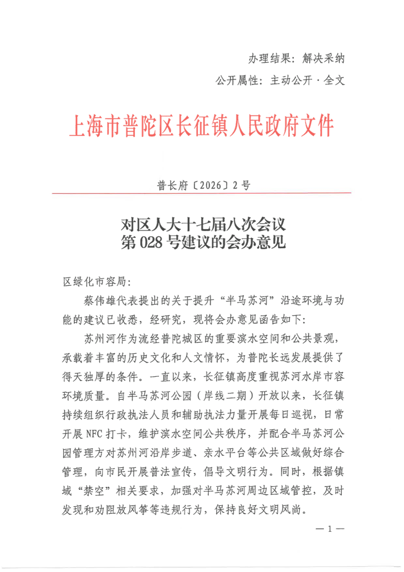 蔡伟雄代表提出的关于提升“半马苏河”沿途环境与功能的建议已收悉,经研究,现将会办意见函告如下: