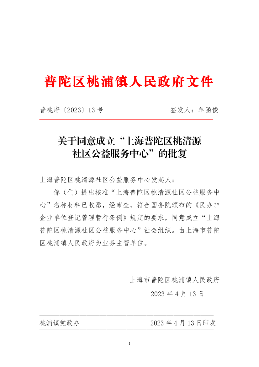 关于同意成立“上海普陀区桃清源社区公益服务中心”的批复