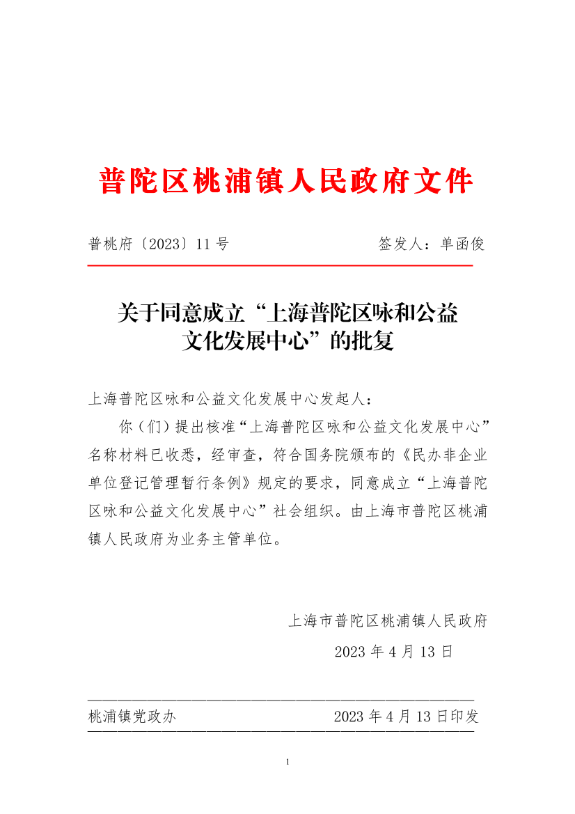 关于同意成立“上海普陀区咏和公益文化发展中心”的批复