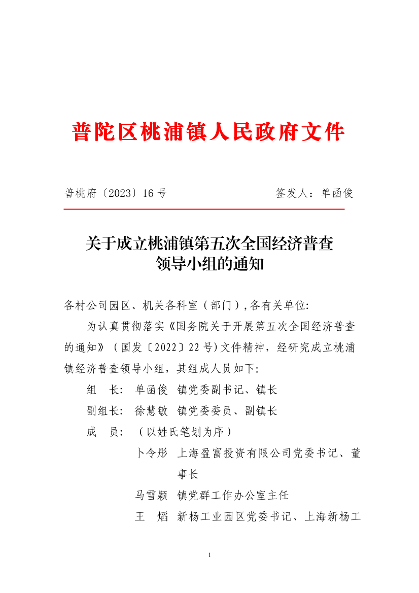 关于成立桃浦镇第五次全国经济普查领导小组的通知