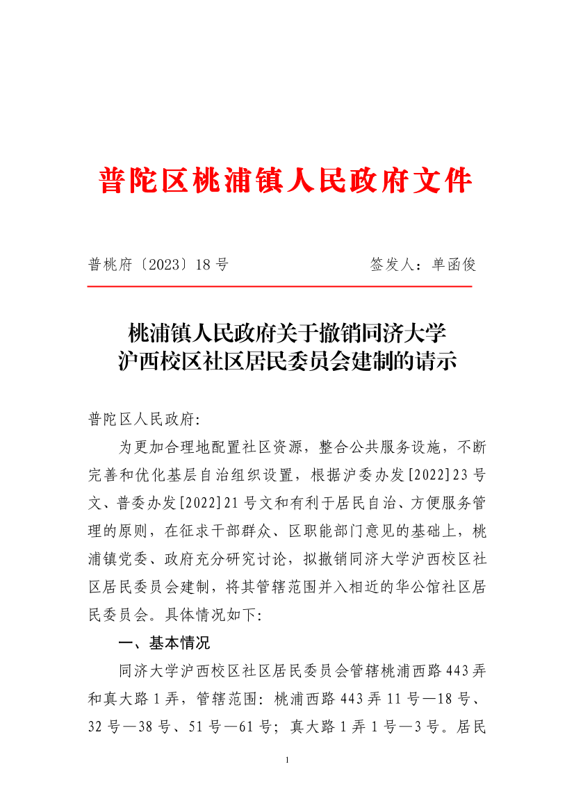 为更加合理地配置社区资源,整合公共服务设施,不断完善和优化基层自治组织设置,根据沪委办发[2022]23号文、普委办发[2022]21号文和有利于居民自治、方便服务管理的原则,在征求干部群众、区职能部门意见的基础上,桃浦镇党委、政府充分研究讨论,拟撤销同济大学沪西校区社区居民委员会建制,将其管辖范围并入相近的华公馆社区居民委员会。具体情况如下: