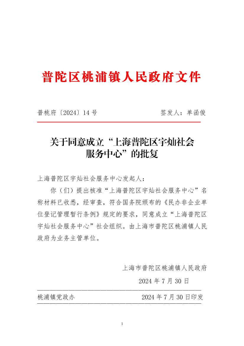 关于同意成立“上海普陀区宇灿社会服务中心”的批复