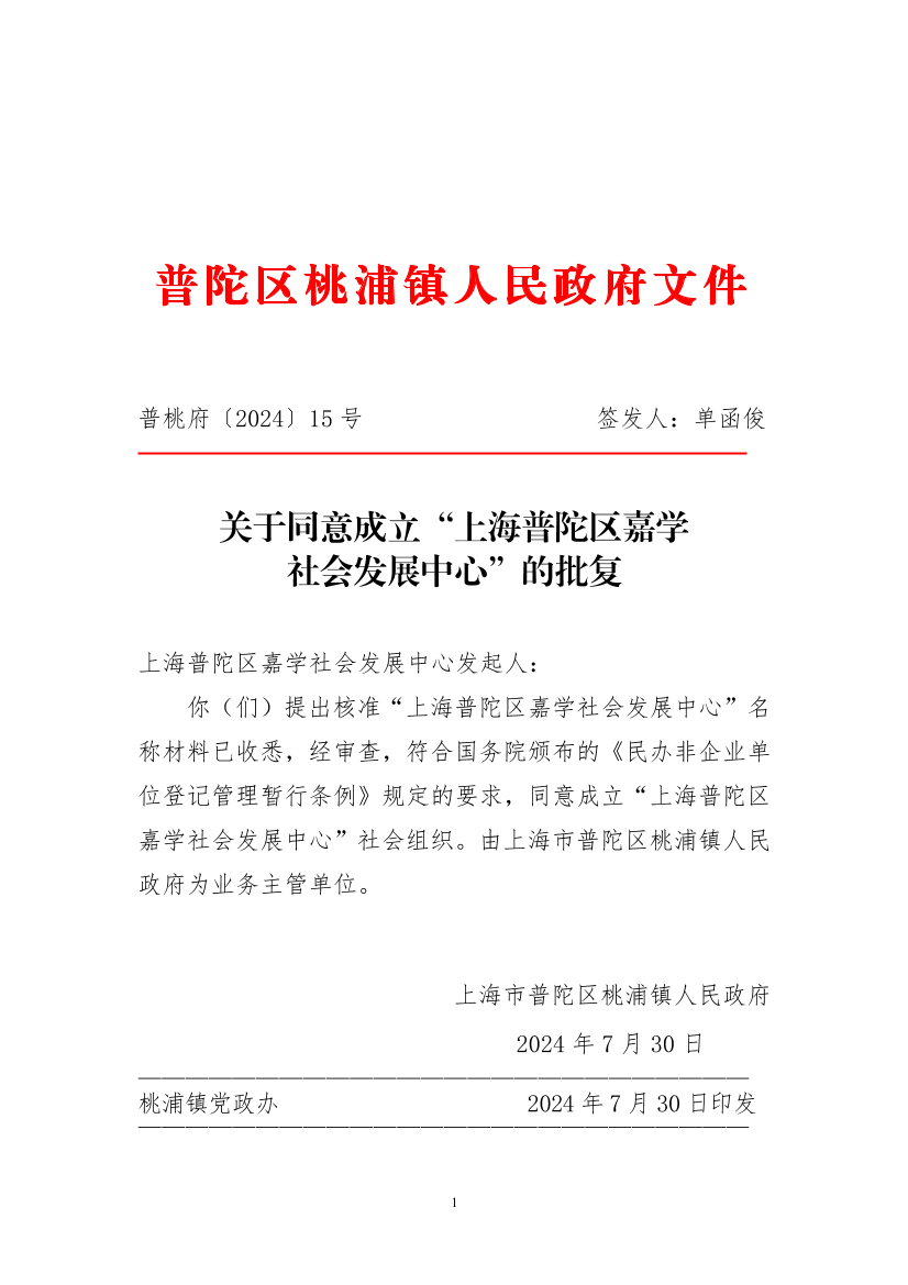 你(们)提出核准“上海普陀区嘉学社会发展中心”名称材料已收悉,经审查,符合国务院颁布的《民办非企业单位登记管理暂行条例》规定的要求,同意成立“上海普陀区嘉学社会发展中心”社会组织。由上海市普陀区桃浦镇人民政府为业务主管单位。