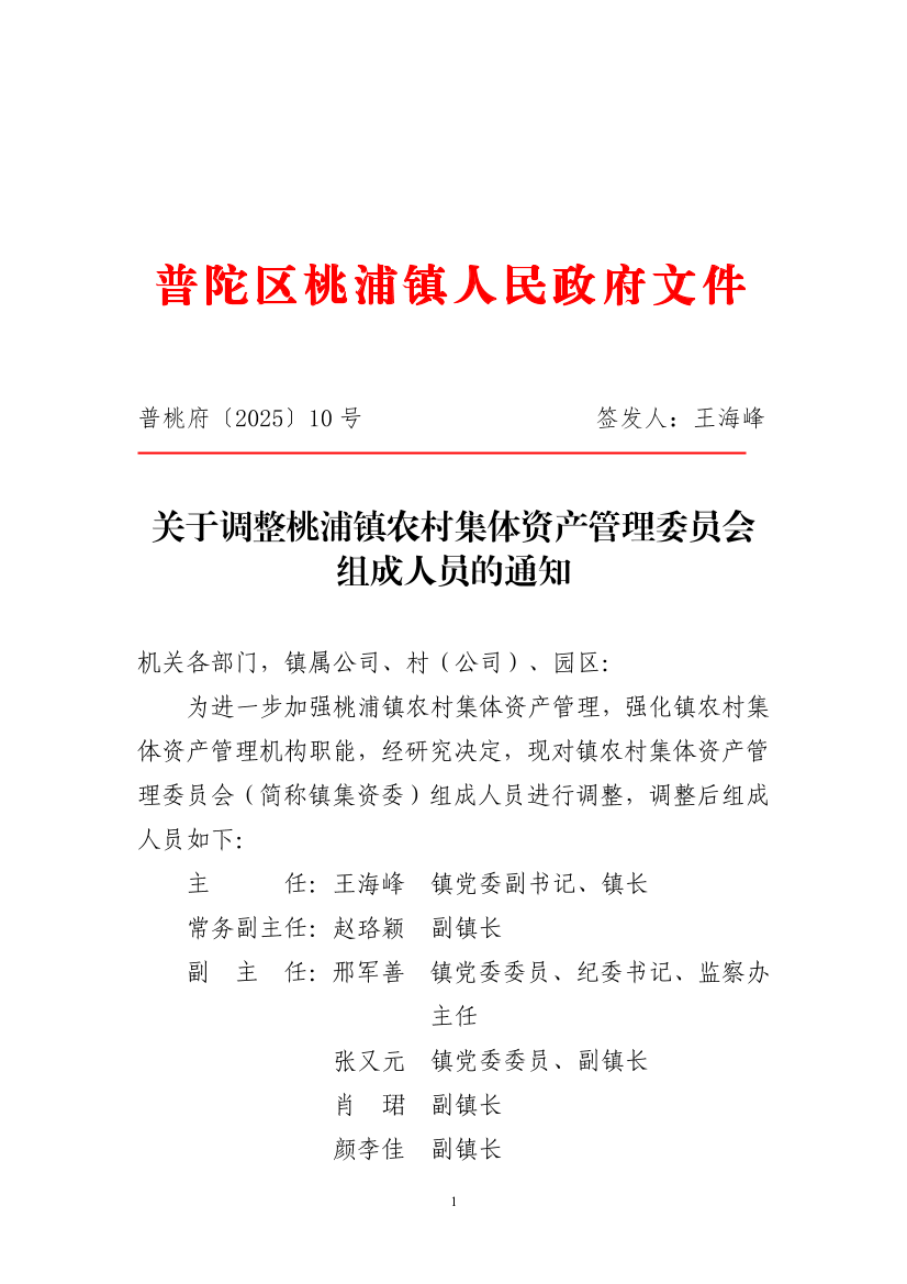 为进一步加强桃浦镇农村集体资产管理,强化镇农村集体资产管理机构职能,经研究决定,现对镇农村集体资产管理委员会(简称镇集资委)组成人员进行调整,调整后组成人员如下: