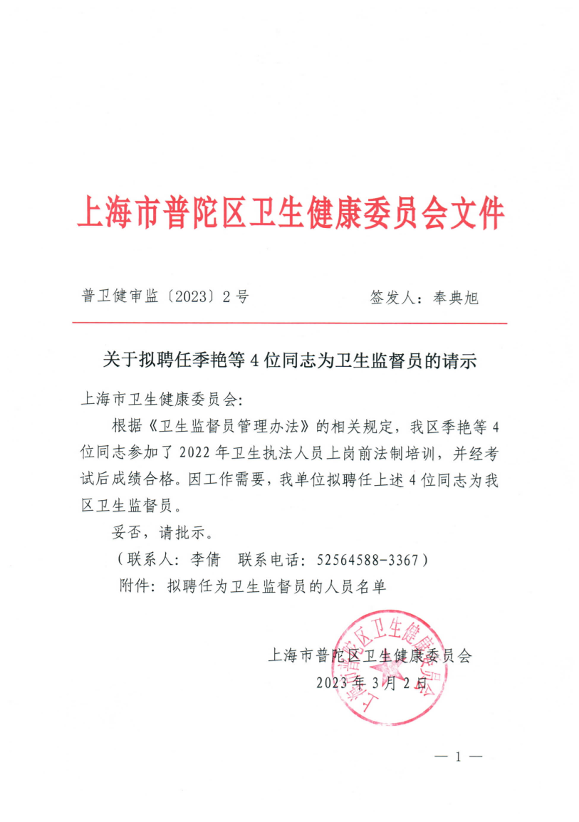 关于拟聘任季艳等4位同志为卫生监督员的请示