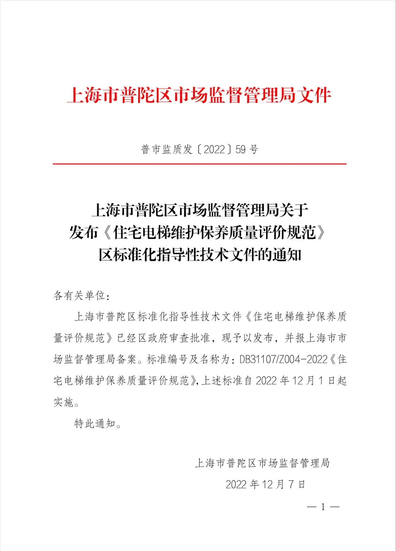 上海市普陀区市场监督管理局关于发布《住宅电梯维护保养质量评价规范》 区标准化指导性技术文件的通知