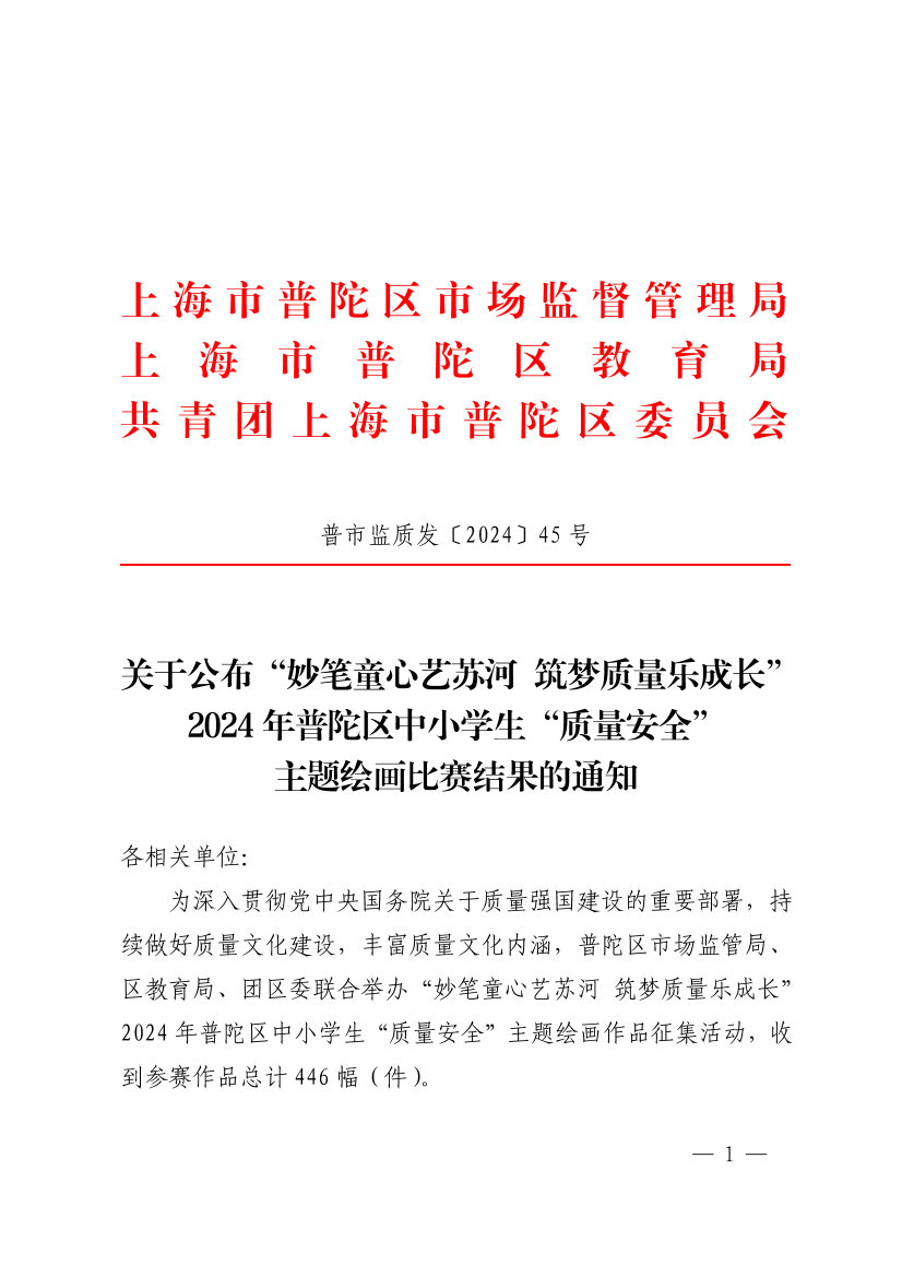 关于公布“妙笔童心艺苏河筑梦质量乐成长” 2024年普陀区中小学生“质量安全” 主题绘画比赛结果的通知