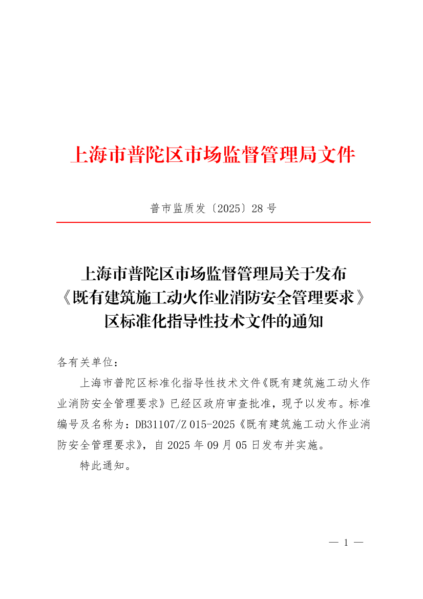 上海市普陀区市场监督管理局关于发布《既有建筑施工动火作业消防安全管理要求》区标准化指导性技术文件的通知