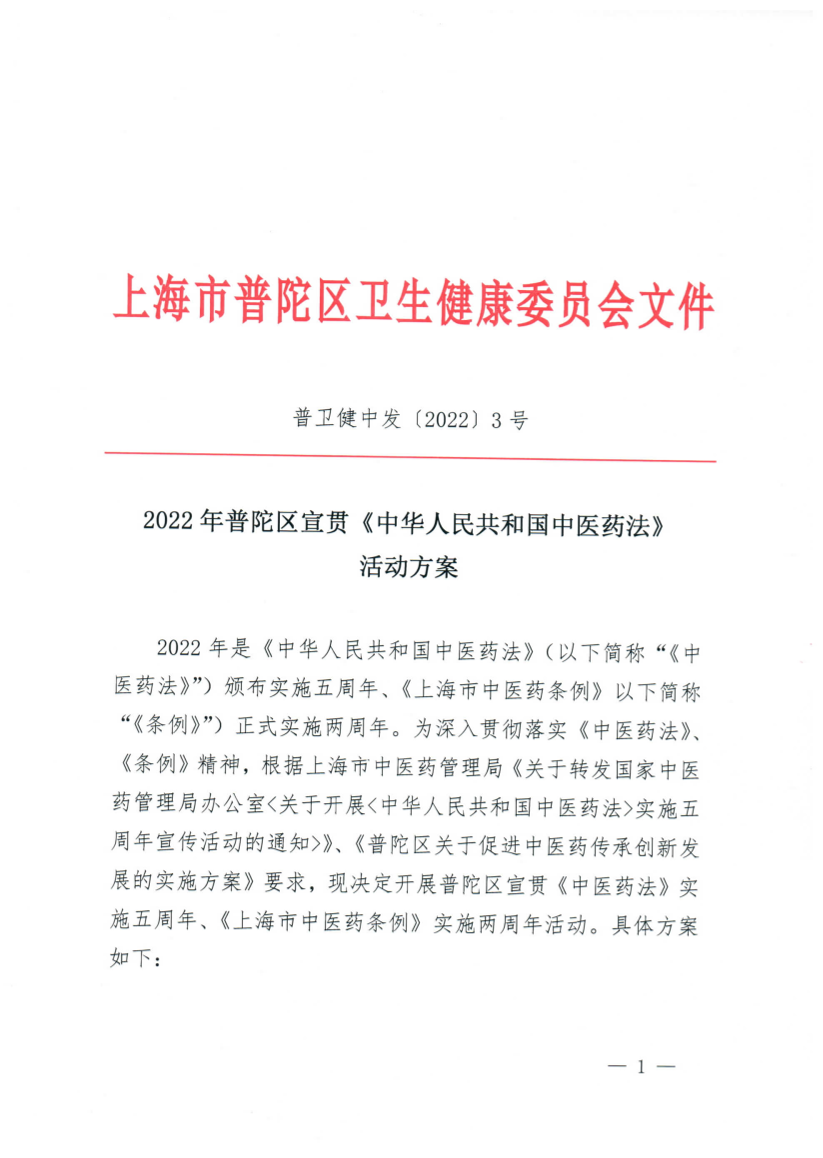 2022年普陀区宣贯《中华人民共和国中医药法》活动方案