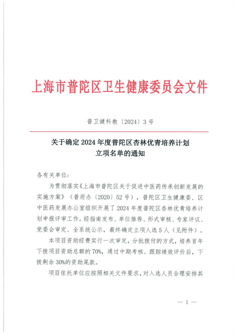 关于确定2024年度普陀区杏林优青培养计划立项名单的通知