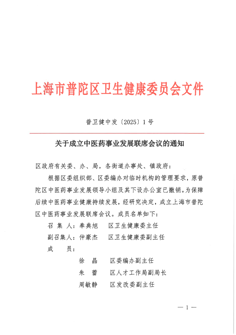 根据区委组织部、区委编办对临时机构的管理要求,原普陀区中医药事业发展领导小组及其下设办公室已撤销。为保障后续中医药事业健康持续发展,经研究决定,成立上海市普陀区中医药事业发展联席会议。成员名单如下: