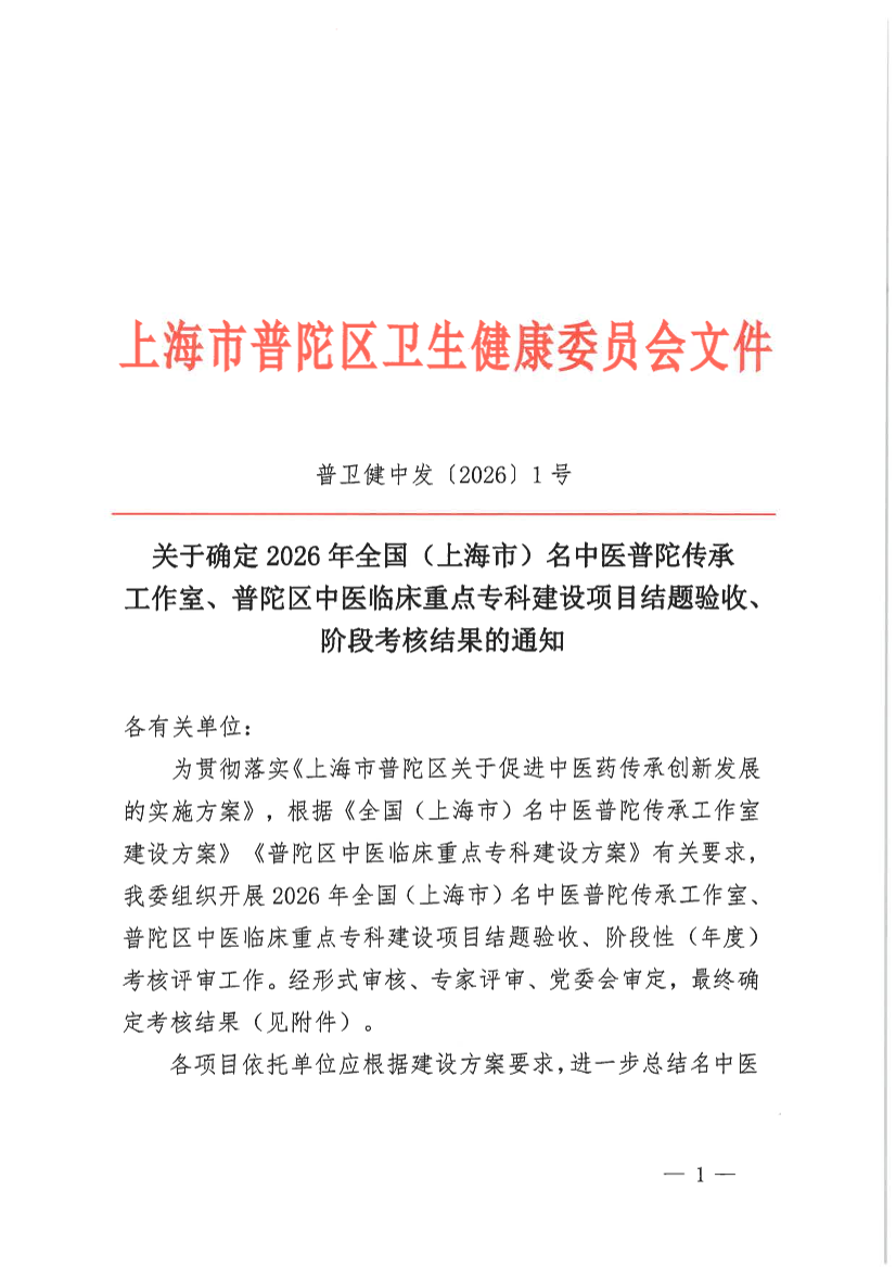关于确定2026年全国(上海市)名中医普陀传承工作室、普陀区中医临床重点专科建设项目结题验收、阶段考核结果的通知