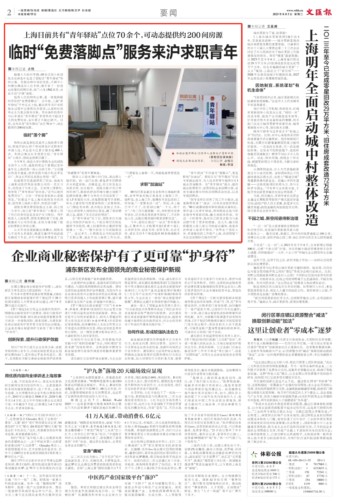 今天(2025年8月5日),《文汇报》要闻版关注普陀区“青年驿站”,报道了位于桃浦镇武威东路718号的“青年驿站”和欣公寓——这里专门开辟15间单人房,为来沪求职青年提供临时免费住宿服务,成为他们在沪打拼的暖心“落脚点”。