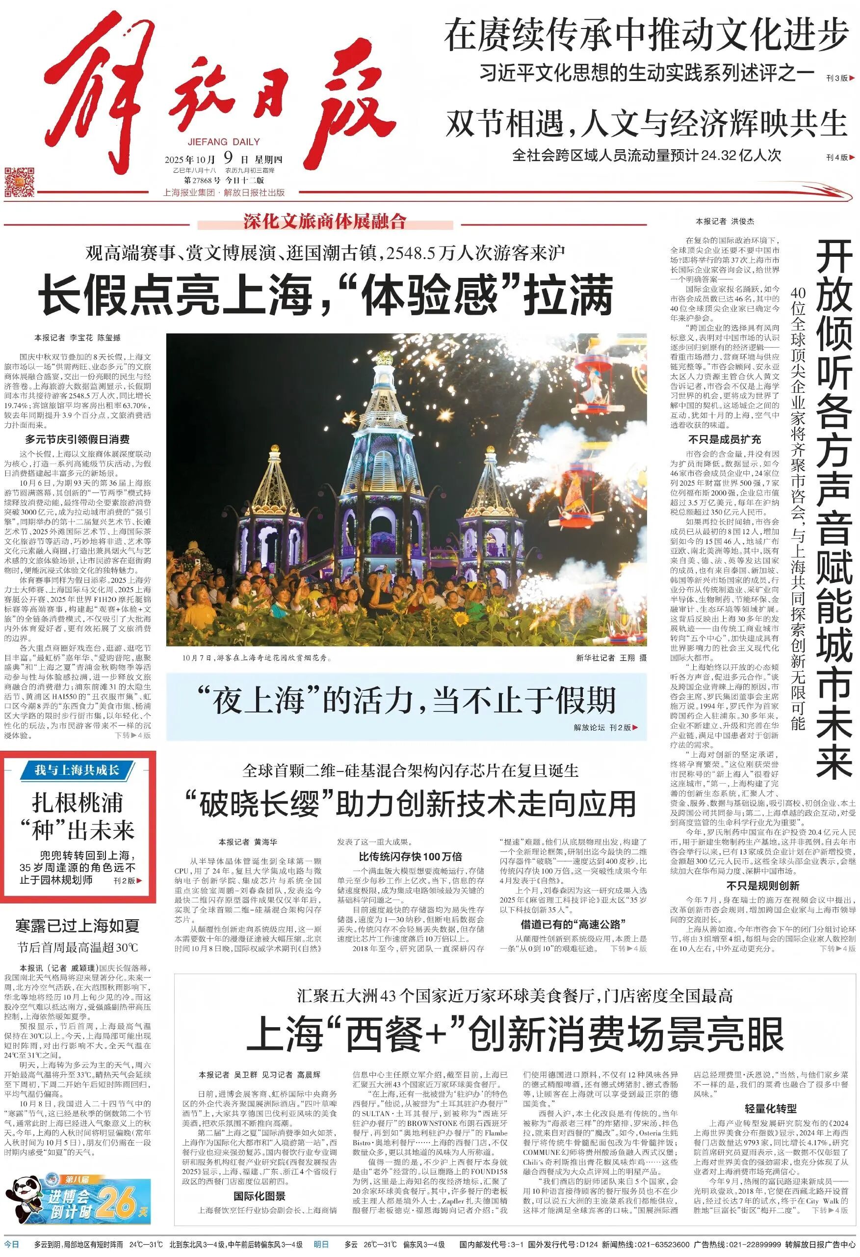 10月9日,《解放日报》头版和2版要闻报道:扎根桃浦,“种”出一片未来