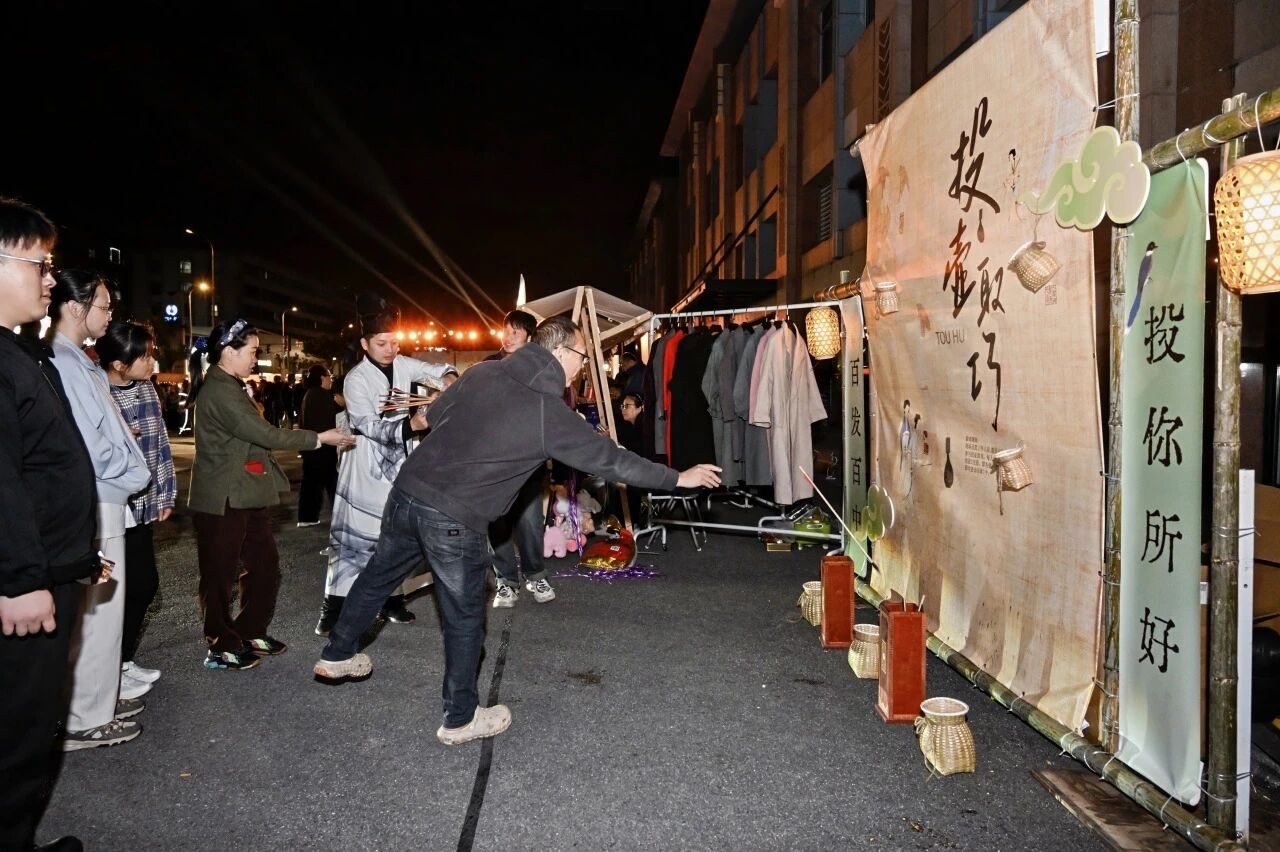 为让居民深度触摸传统文化,活动现场特别设置投壶、蹴鞠、捶丸、取香四大民俗游戏互动区,将“古代雅趣”搬进现代集市。同步推出的“集章兑礼”机制更点燃参与热情:居民完成任意游戏任务即可收集印章,集齐四枚便能兑换小礼品。现场随处可见居民闯关的身影,欢声笑语不断。