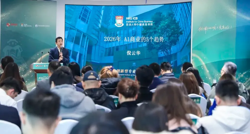 在主题演讲环节,香港大学中国商业学院客座教授、微软亚洲研究院前副院长、美国华盛顿大学电机工程博士潘天佑以《AI时代新创与大企业的竞合关系》为题,从新创企业的突围路径到大企业的生态布局,为企业在竞争与和合作中协同发展提供思路。香港大学中国商业学院副教授、NXT智库咨询创始人倪云华聚焦《2026年AI商业五大趋势》,从商业与科技双驱动视角,为企业预判行业风口、把握发展先机提供了重要参考。
