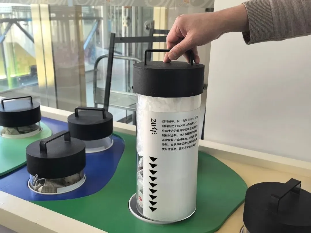 以实物互动沙盘模拟自然界的地貌环境,多种常见生活垃圾模型被陈列在数个容器之中并埋藏在沙盘里。市民可以提起这些容器,直观地看到容器内部的生活垃圾,并通过文字了解这些生活垃圾自然降解所需要的时间以及它们对人类生存环境的影响。