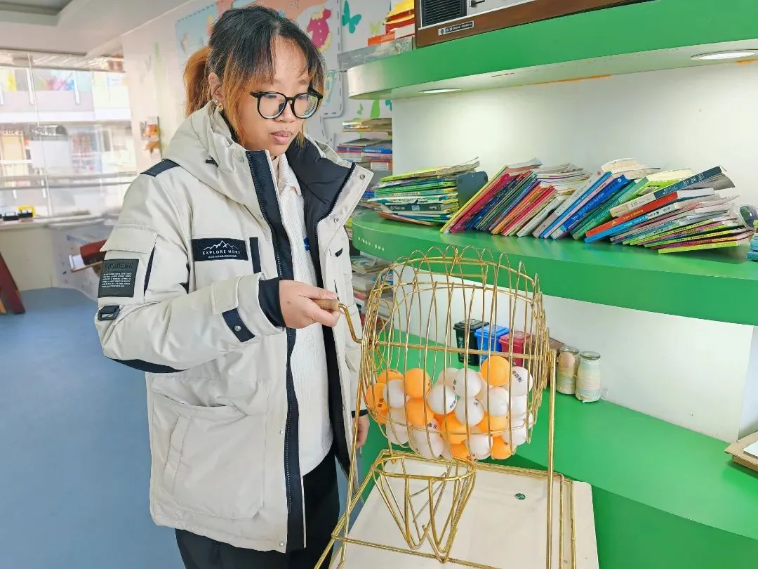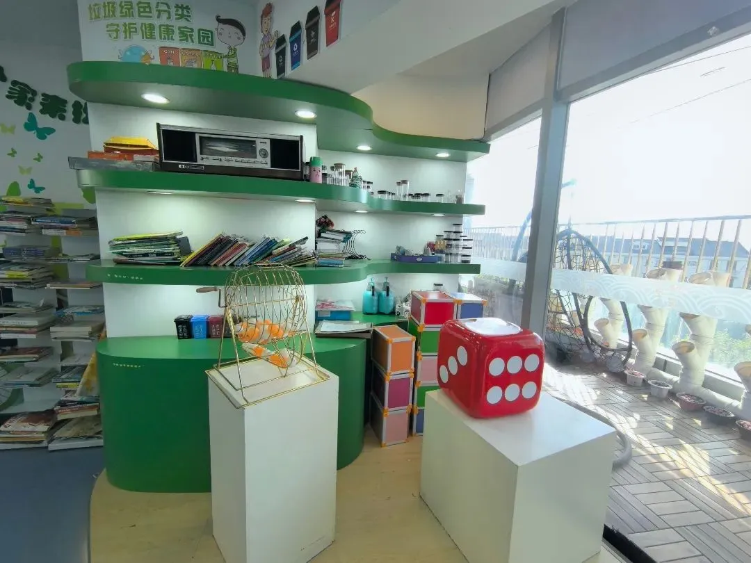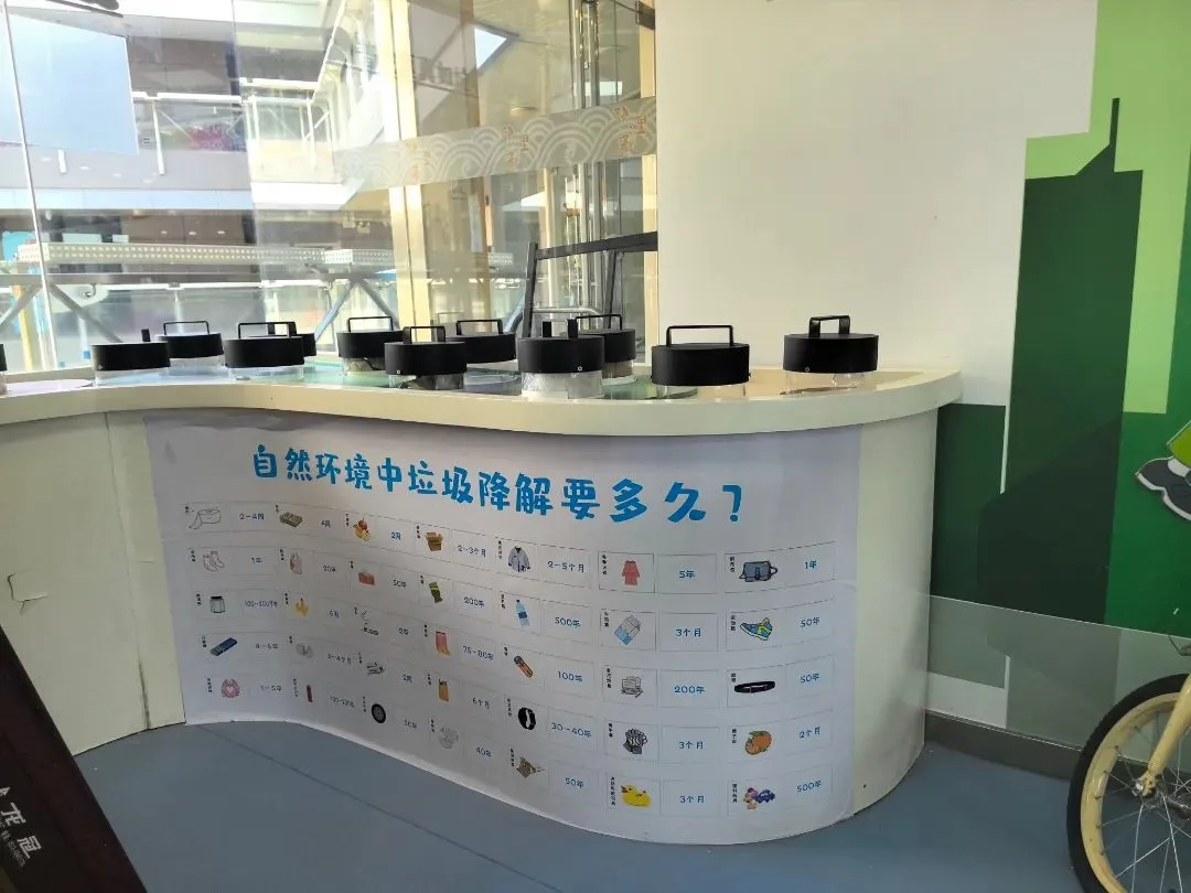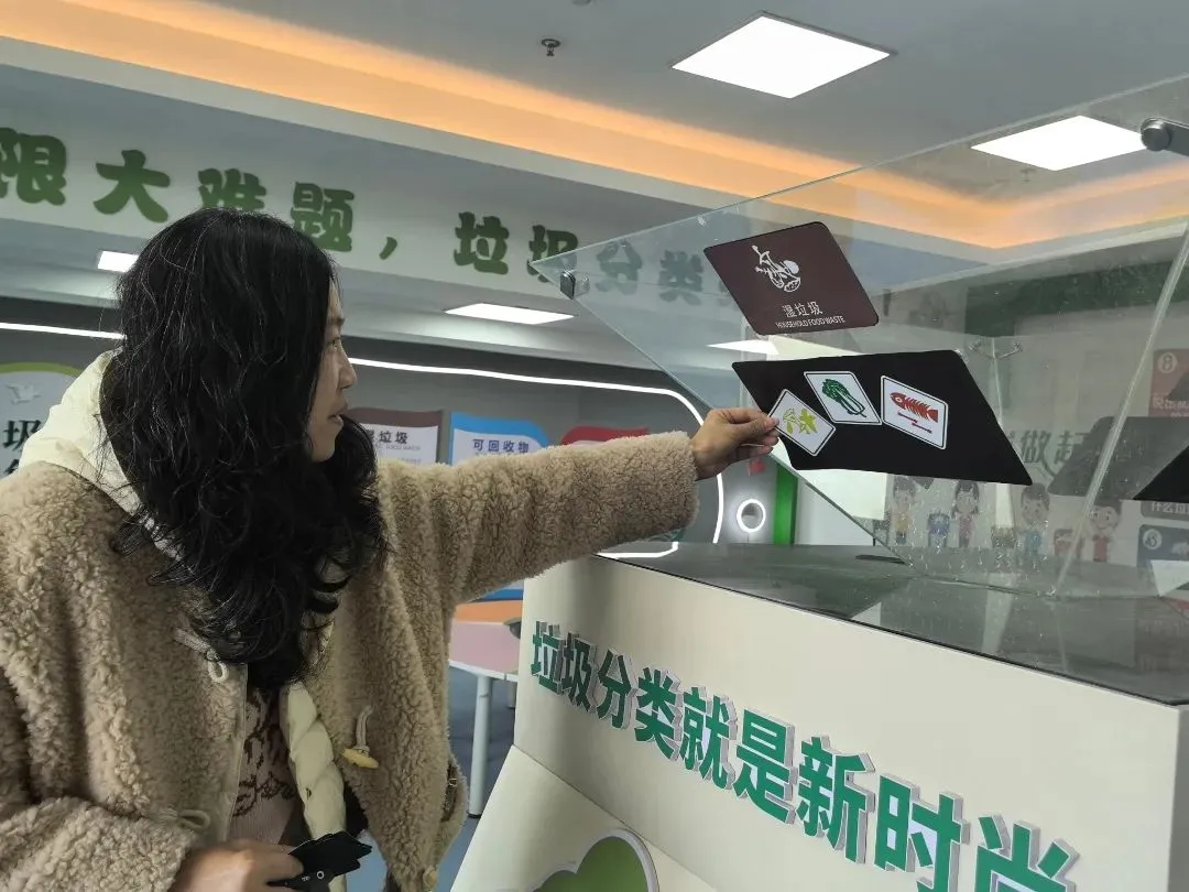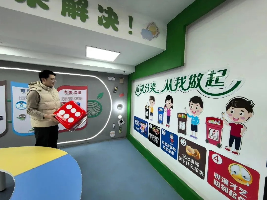设有垃圾分类“摇奖机”,机器内的小球代表各类垃圾。摇出后分类投放至对应四色垃圾桶中,于趣味中增强环保意识。