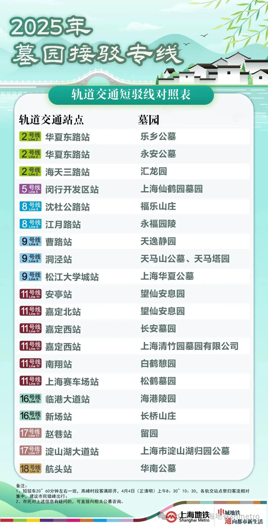 2025年03月31日 来源: 长征镇申通地铁集团介绍,2025年清明节假期为4月4日(周五)至4月6日(周日)。祭扫高峰出现在3月29日至30日、4月4日至6日。今年本市多家墓园仍延续推行“地铁+短驳”服务,其中,涉及轨道交通2、5、8、9、11、16、17、18号线,共8线18站。清明地铁出行提示详见↓