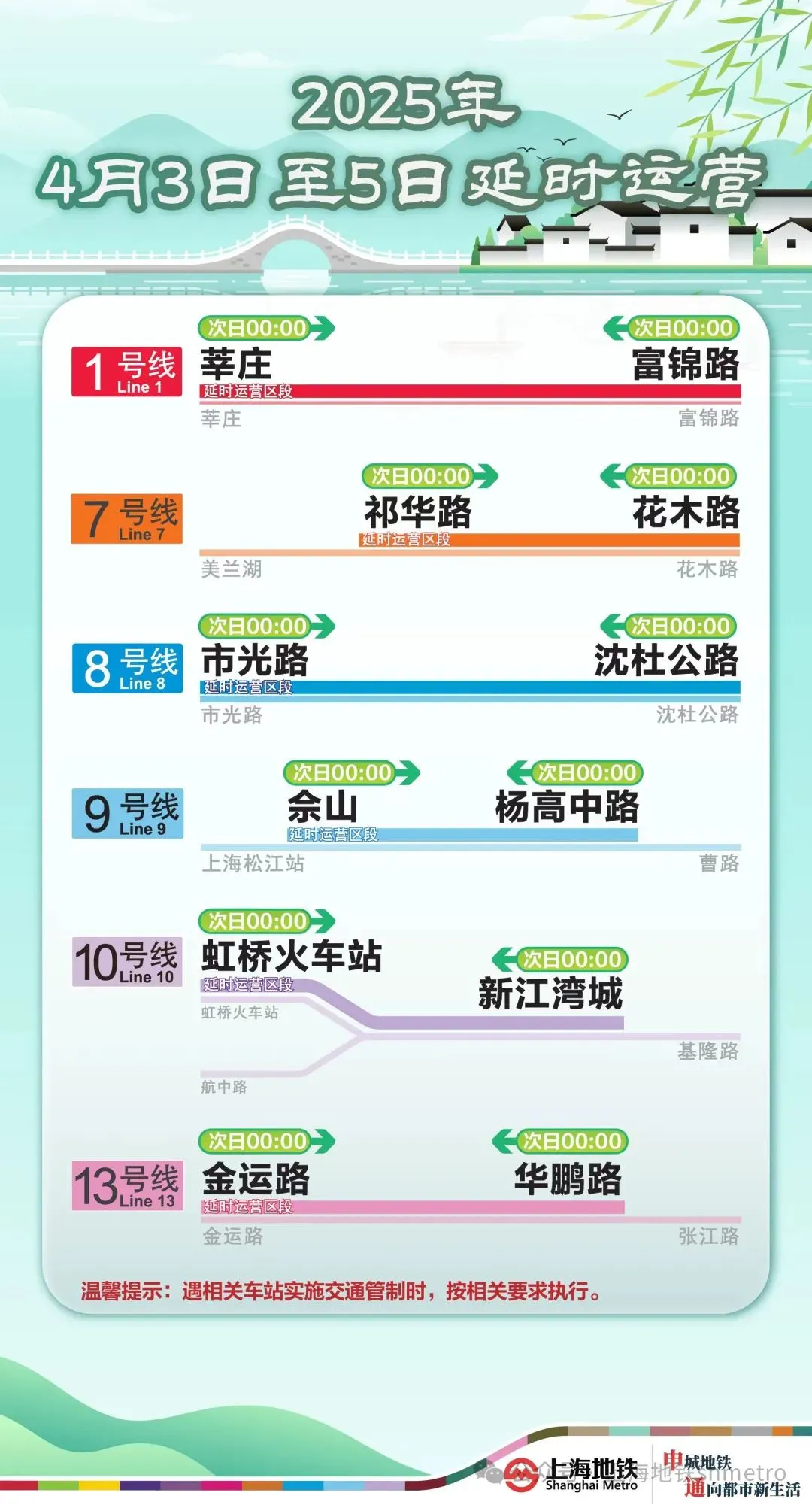 同时,4月3日至5日,上海地铁1、7、8、9、10、13号线执行延时运营方案。