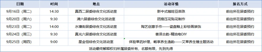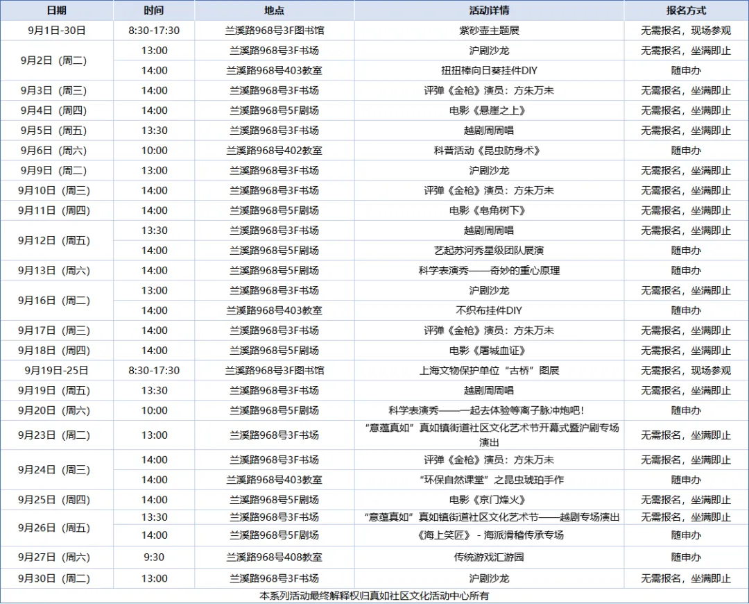 2025年08月29日 来源: 长征镇这个九月,无需远行,家门口的文化活动中心便是知识与欢乐的汇聚地。真如镇街道社区文化活动中心精心准备了丰富多彩的文化活动。从典雅的非遗技艺体验到前沿的科学探索,从静谧的艺术展览到欢乐的文艺汇演,为各年龄段的居民朋友打造充满创意、知识与乐趣的活力社群。