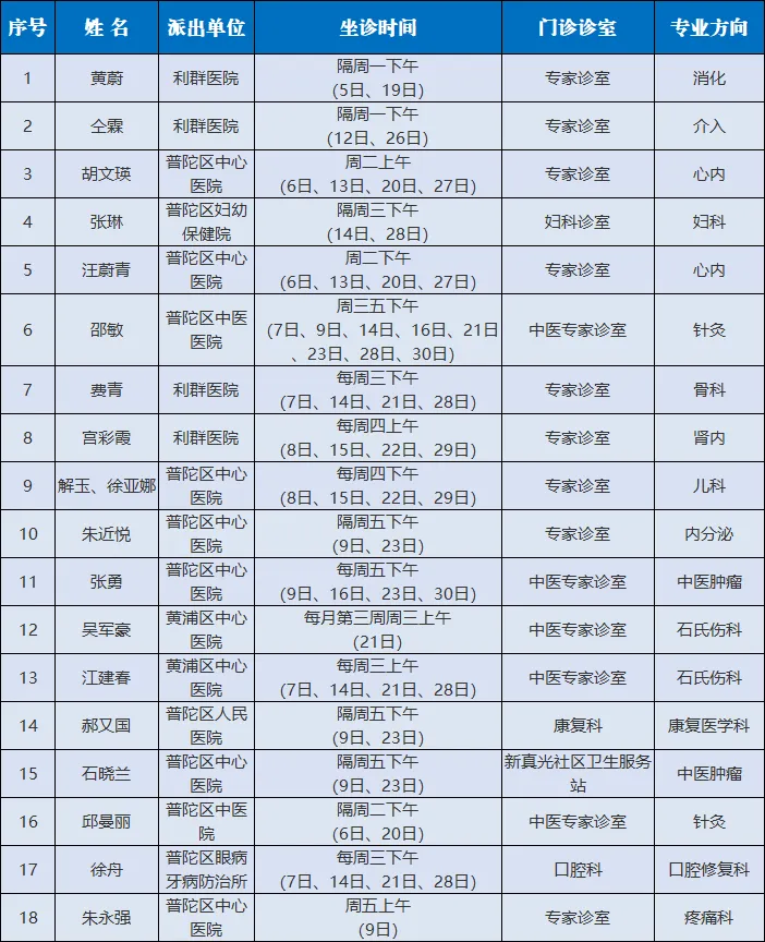 真如社卫2026年1月专家门诊计划出炉