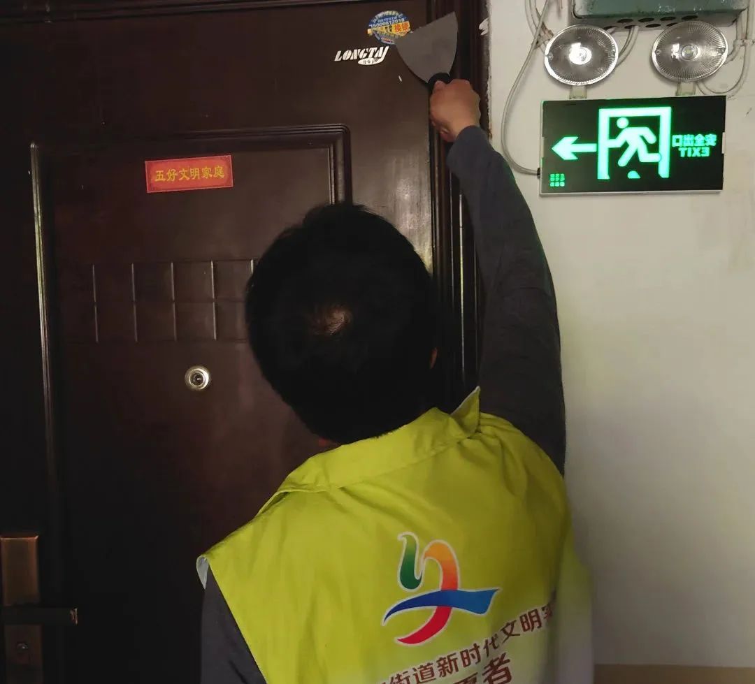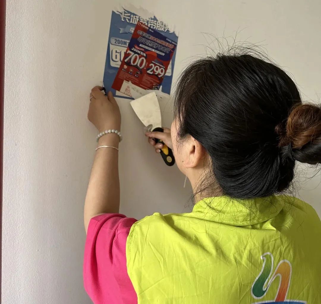 各居民区常态化开展小广告专项整治行动。清理过程中,居民区工作人员、物业、志愿者随身携带小铲子、刷子等工具,采取逐层巡查的方式,一边巡查、一边清理,对乱张贴、乱涂写、乱刻画的小广告进行清理。