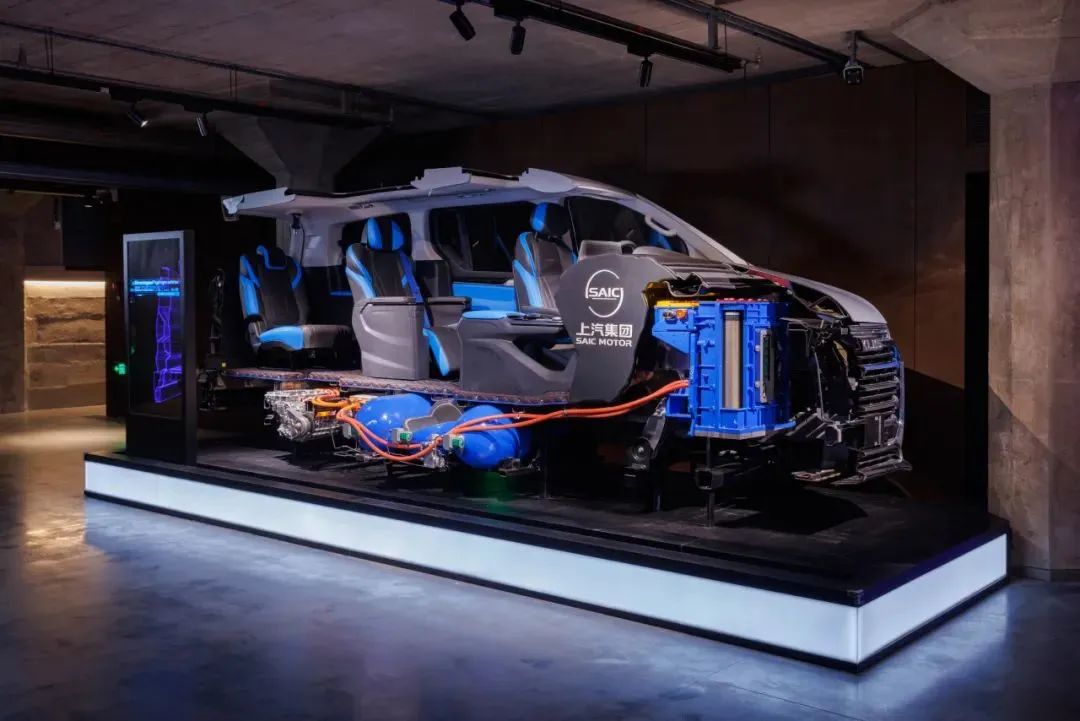 这个炫酷的汽车截面是上汽氢燃料电池汽车,一旁的透明移动屏展示了汽车的主要部件与工作原理。