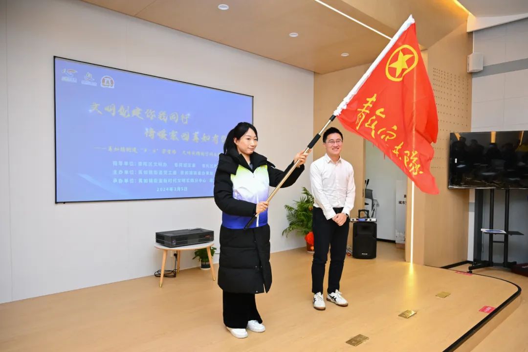 张笑征为“真如意·靠谱办”青年志愿服务队授旗