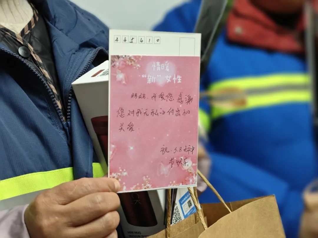 在天汇广场党群服务站,“两新”书记工作室开展了“情暖新女性”活动,为新业态新就业群体、环卫工人等女性户外工作者们送上节日的祝福。工作室准备了明信片,邀请“新”女性为远在他乡的母亲、姐妹等亲手写上她们的思念和祝福,把节日温暖也带给她们的亲人。