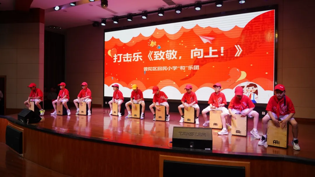 在普陀区回民小学“和”乐团带来的打击乐演奏《致敬·向上》中,活动拉开序幕。现场,屯旺、魏静、王珏共同启动普陀区民族宗教政策法规宣传学习月。