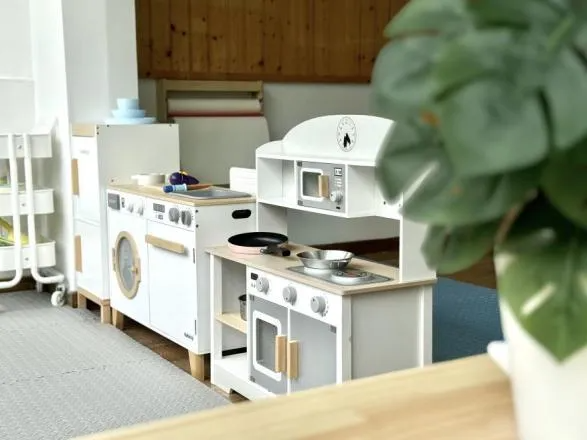 目前“宝宝屋”每日可提供10个托位,教室内设有攀爬运动、娃娃家角色扮演、艺术涂鸦、感统运动、积木构建、绘本阅览等区域,让幼儿可以自主游戏,提升动手操作能力。同时,还创设幼儿与同伴互动的环境,培养他们的创造力、想象力。