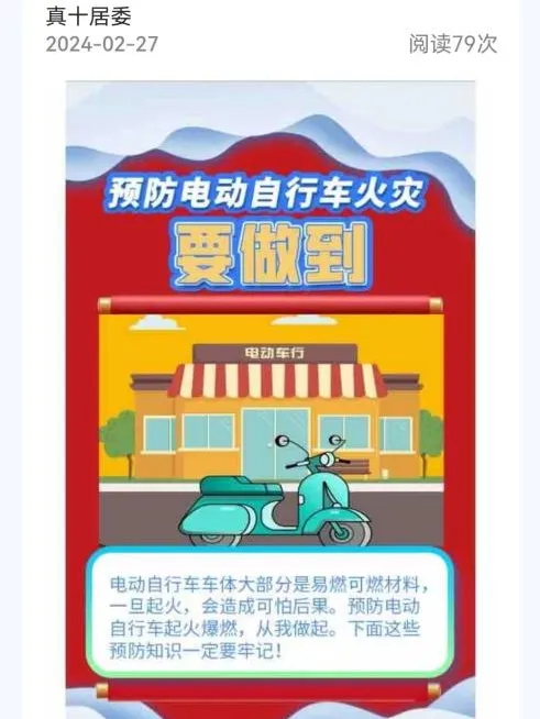 采用线上+线下相结合的宣传方式,不断通过楼栋微信群进行案例宣传,在社区云发布电动自行车安全使用告知书,并在小区楼栋处、小区电子屏、宣传栏等处张贴海报,积极发动网格员、社区党员、楼组长、平安志愿者等进行入户宣传,营造浓厚氛围,使居民充分认识到违规停放及充电的危害性。