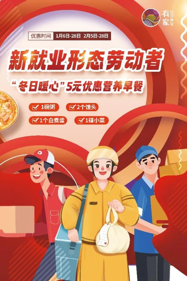此外,为了进一步加大对新业态群体的关心、关爱力度,努力提升新业态群体的幸福指数,高陵党群服务中心通过共策共力,联合高陵社区长者食堂达成了“一日之计在于晨,食在高陵”的口号,为网约车司机、环卫工人、快递小哥等新业态劳动者提供“冬日暖心”5元优惠营养早餐,让大家可以吃饱吃好,开启能量满满的一天。